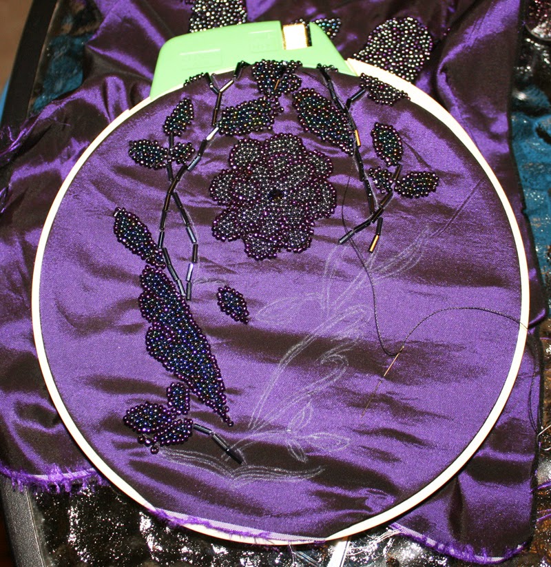The colour is off because of the bad lighting. The fabric is actually a dark purple, and the flower is outlined in lavender, and the petals are done with hematite coloured beads. The leaves are also outlined in lavender and the leaves themselves are multicoloured metallic beads. Looks much better in person!